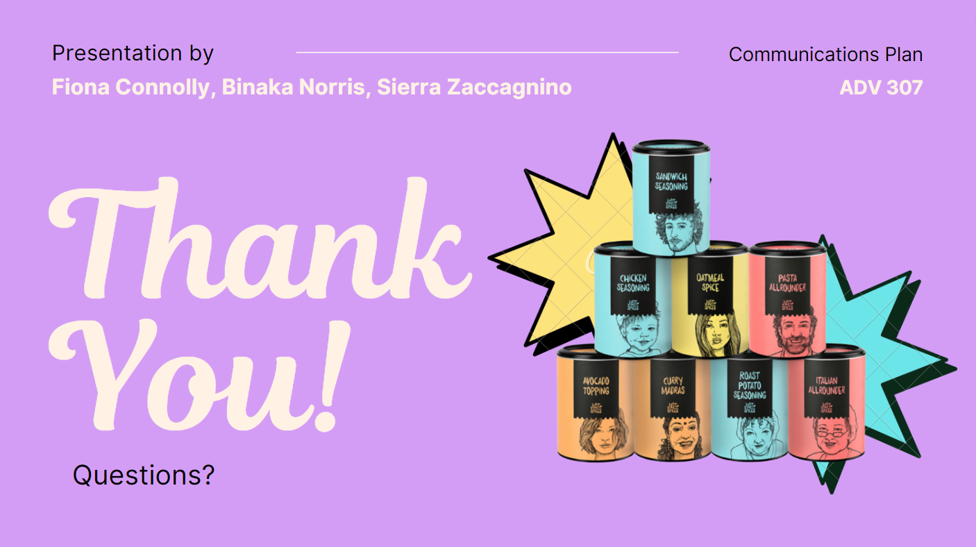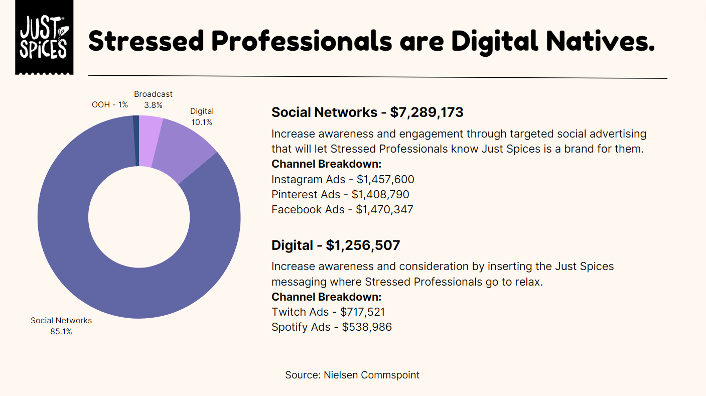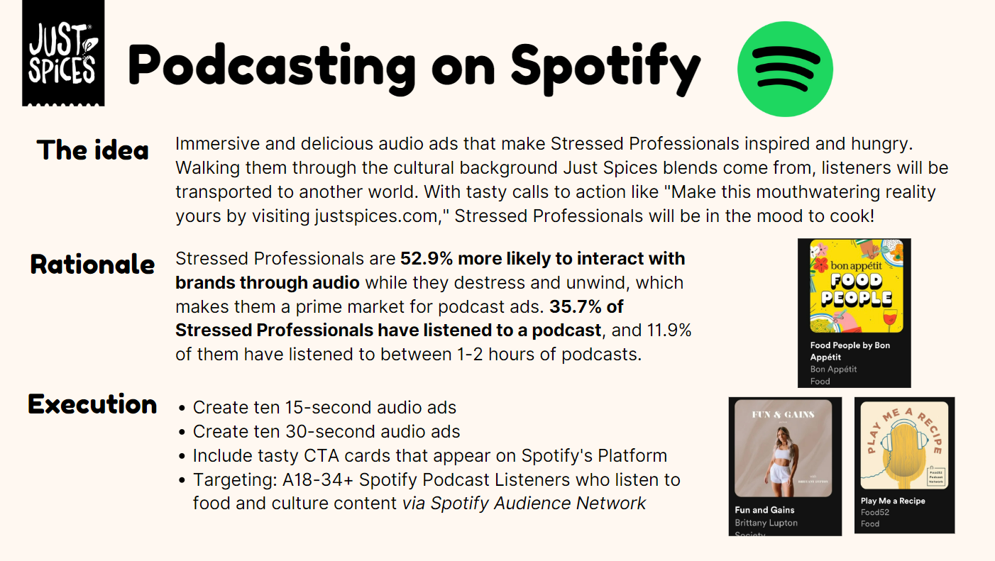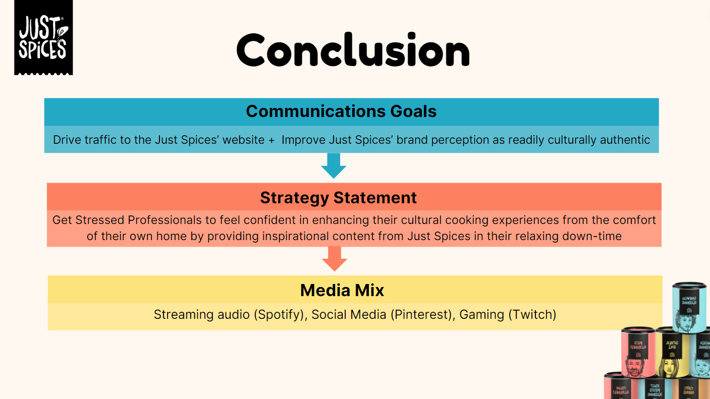 Working with the emerging Kraft Heinz brand Just Spices, we created a media communications plan for the launch of their spice blend product in the United States. My teammates and I defined the market and Just Spices’ business challenge, developed an understanding of the target audience, and ultimately crafted a communications brief with activation ideas not only fit to reach our audience, but fit to make profits.
