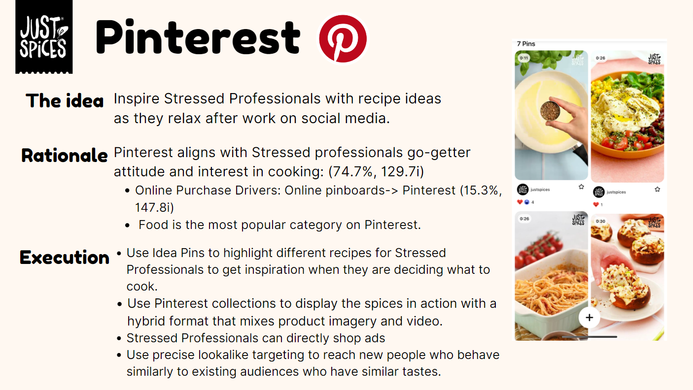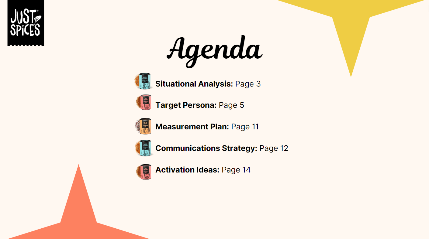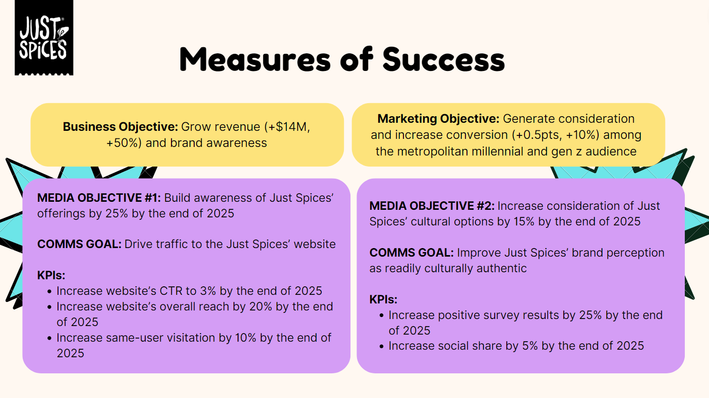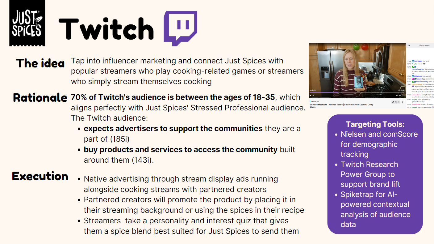 Working with the emerging Kraft Heinz brand Just Spices, we created a media communications plan for the launch of their spice blend product in the United States. My teammates and I defined the market and Just Spices’ business challenge, developed an understanding of the target audience, and ultimately crafted a communications brief with activation ideas not only fit to reach our audience, but fit to make profits.