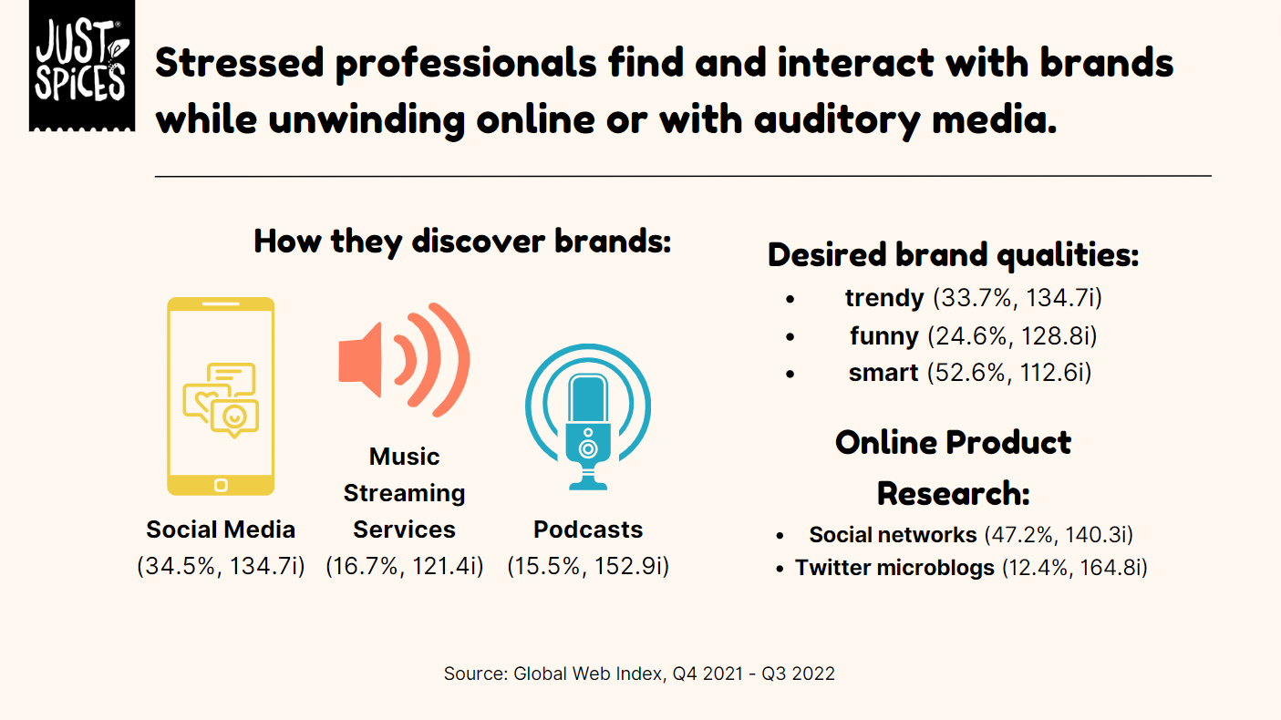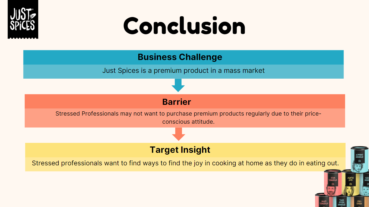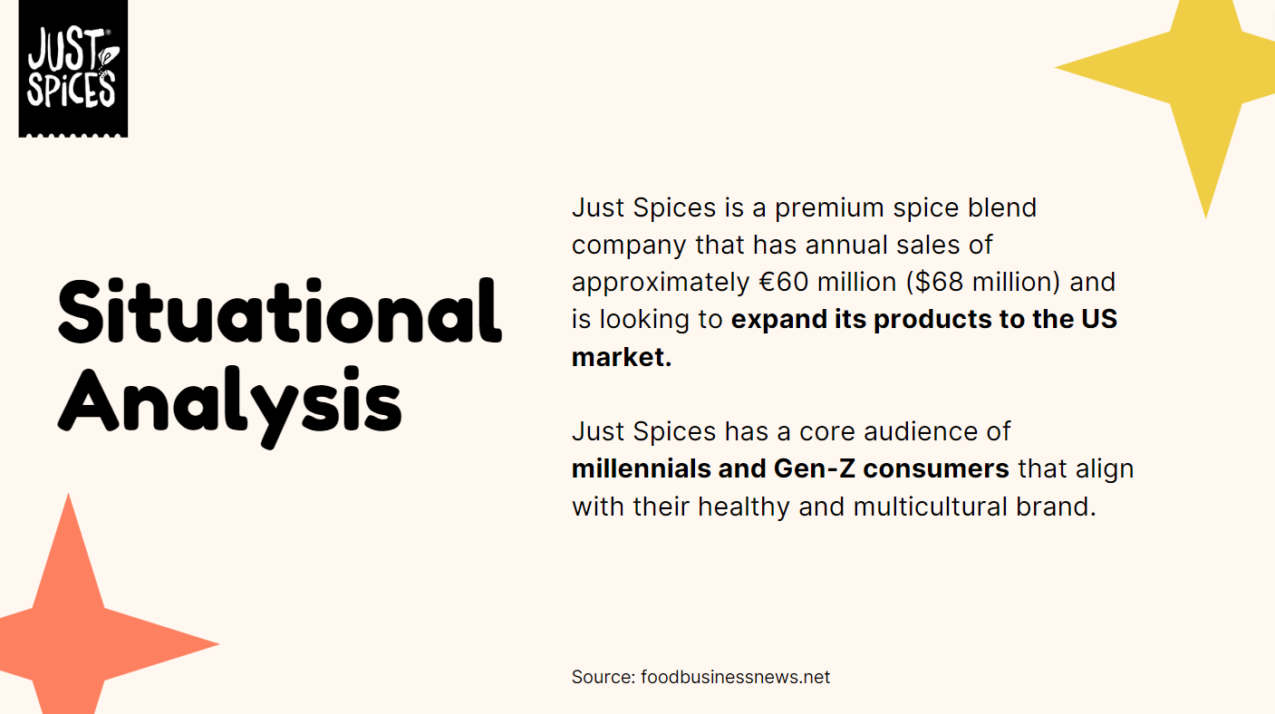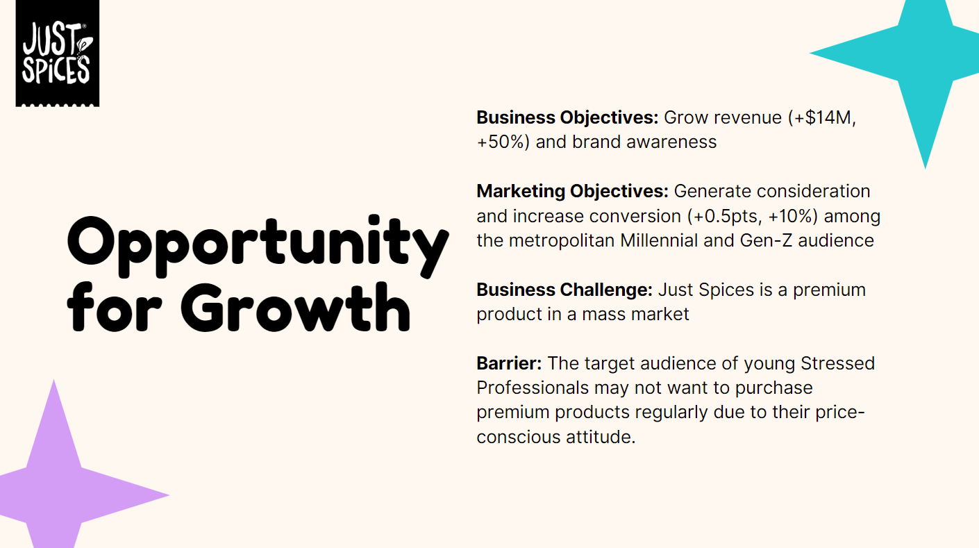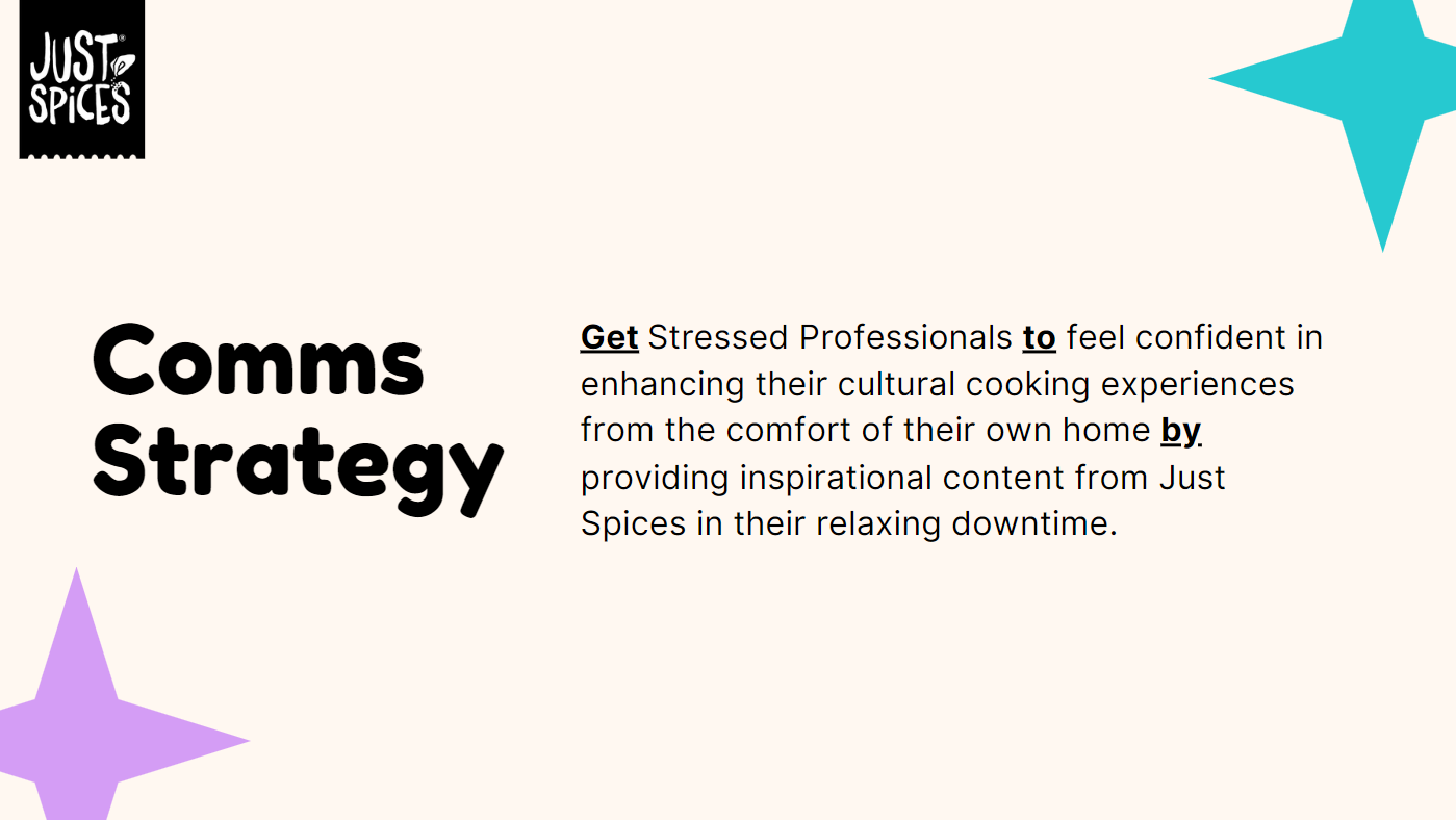 Working with the emerging Kraft Heinz brand Just Spices, we created a media communications plan for the launch of their spice blend product in the United States. My teammates and I defined the market and Just Spices’ business challenge, developed an understanding of the target audience, and ultimately crafted a communications brief with activation ideas not only fit to reach our audience, but fit to make profits.